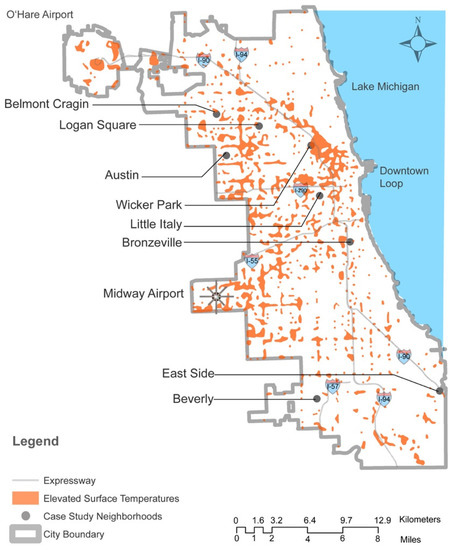 Map illustrating the city of Chicago limits, the eight study neighborhoods, Midway Airport, and the heterogeneous distribution of elevated surface temperatures from a City of Chicago Department of the Environment 2006 study. Data source: City of Chicago Department of Environment GIS database, accessed February 1, 2010 [57] Illustration: by authors and modified from Coseo & Larsen [4].