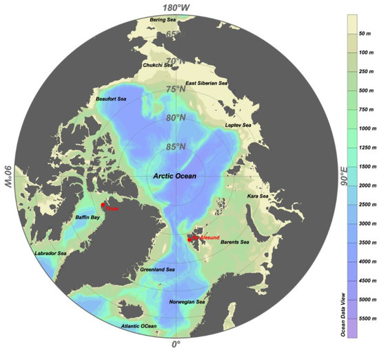 The aerosol sampling was performed at Gruvebadet laboratory located at ~50 m a.s.l. at Ny Ålesund (Svalbard Islands—78.9° N, 11.9° E) and at the Thule High Arctic Atmospheric Observatory (THAAO) located in Thule (Greenland—76.5° N 68.8° W). Both sampling sites are a few kilometers away from the closest village. Figure 1 shows the map of the Arctic with the two sampling sites.