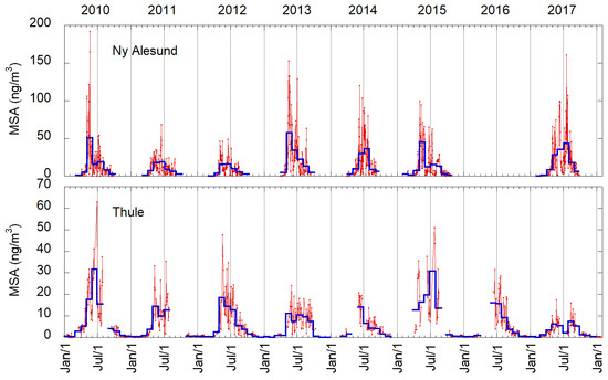 Methanesulfonic acid (MSA) time series at Ny Ålesund and Thule. Red lines represent high resolution data (24 h at Ny Ålesund, 48 h at Thule), blue lines are monthly mean values.