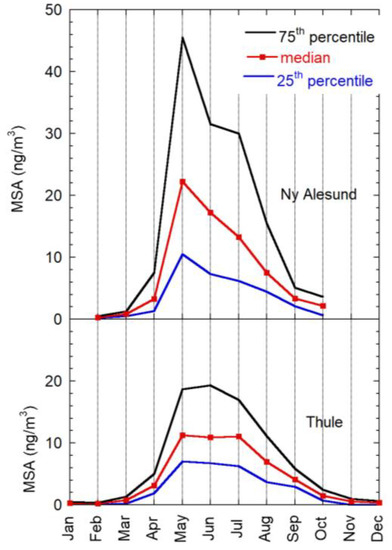 Figure 2 shows the MSA concentration time evolution at the two sites, with high-resolution data in red and monthly mean data in blue. In order to highlight the seasonal pattern, Figure 3 reports the monthly median values for the two sites with the associated first and third quartiles. The MSA concentration usually starts to increase in April at both sites, reaching the largest median (11.2 ng/m3 at Thule and 22.2 ng/m3 at Ny Ålesund) and mean (14.1 ng/m3 at Thule and 33.2 ng/m3 at Ny Ålesund) values in May. It is interesting to notice that the MSA concentration starts to decrease after May in Ny Ålesund, while it remains quite constant until July at Thule, and slowly decreases afterwards.