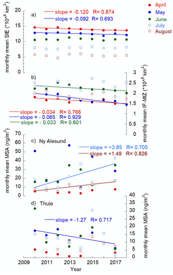 Concerning the July–August multiyear MSA concentration at Thule, we do not observe any significant trend. Conversely, at Ny Ålesund, a significant increasing trend is observed for the time period considered here (2010–2017), confirming and extending the positive trend observed by Sharma at al. [24], for the years 1998–2004 at the Zeppelin site in Ny Ålesund. It is interesting to notice that such as increasing trend in MSA concentration in July and August at Ny Ålesund is not related to a decreasing trend in SIA (SIE) or to the increasing in IF-MIZ area in the corresponding months.