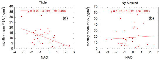 Correlations between monthly mean values of MSA and the North Atlantic Oscillation (NAO) index at Thule (a) and at Ny Ålesund (b).