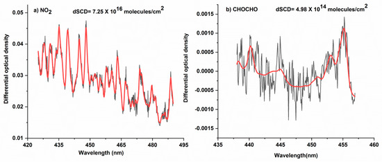 Characteristic DOAS spectral fitting of the spectrum obtained at a viewing angle of 30° on 11 November 2018 for (a) NO2 and (b) CHOCHO. Legend: dSCD, differential slant column density.