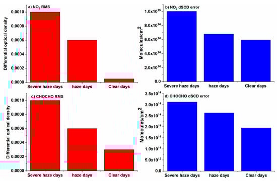 (a) NO2 RMS (b) NO2 dSCD error, (c) CHOCHO RMS and (d) CHOCHO dSCD error under different weather conditions.