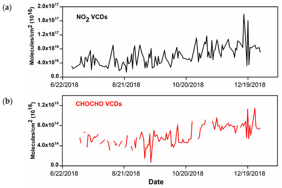 Time series of (a) NO2 and (b) CHOCHO from 1 July 2018 to 31 December 2018. Legend: VCDs, vertical column densities.