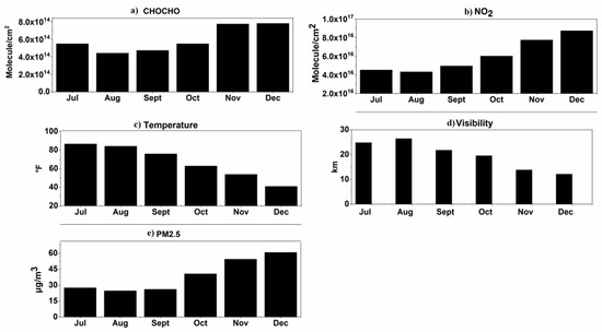 In the lower atmosphere, a substantial driving factor of pollutant distribution in terms of chemical behavior and residence time is the meteorological condition of the locality. Hence, the relation of trace gases, i.e., NO2 and CHOCHO, with different meteorological parameters is discussed here. Figure 5 shows monthly variations of PM2.5, temperature, visibility, NO2, and CHOCHO. The average concentration of PM2.5 is seen to increase gradually from July to December. A similar trend is observed for the concentration of NO2 and CHOCHO, whereas air temperature and visibility show a decreasing trend. The decrease in visibility due to an increase in PM2.5 is obviously to have resulted in the more frequent occurrence of haze days in the month of December.