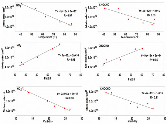 The increasing trend of CHOCHO and NO2 VCDs can be explained by the fact that photolysis is a major sink of both these trace gases. During the winter months when haze conditions start to occur more frequently due to an increase in PM2.5, visibility decreases. The rate of photolysis decreases, as visibility is low. This results in the accumulation of NO2 and CHOCHO because their major sink, i.e., the rate of photolysis, is very low. The observed increase in CHOCHO from October may also be related to heating during winter. This finding is consistent with glyoxal retrieved over Beijing and Northern China from OMI (Ozone monitoring instrument) satellite data [35,36]. The increase in the concentration of NO2 may also be related to an increase in the burning of fossil fuels during the winter months. Figure 6 shows correlation plots of NO2 and CHOCHO with meteorological parameters.