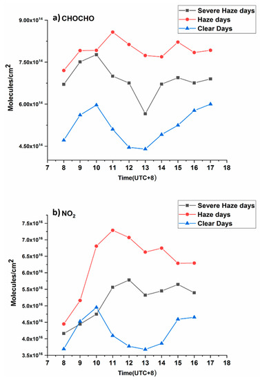 During clear days, due to a faster photolysis rate, a certain decrease in CHOCHO emissions is observed during the afternoon; haze and heavy haze days do not depict such a trend. CHOCHO concentrations during severe haze days are lower than during haze days, which can be explained by taking into account the fact that DOAS retrieval for CHOCHO is very sensitive and is underestimated during severe haze days.