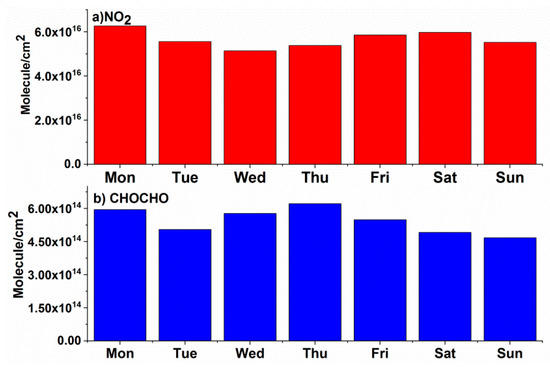 Weekly cycles for (a) NO2 and (b) CHOCHO VCDs monitored in Hefei, China.