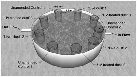 An illustration of the experimental mesocosm used in this study. Treatments included unamended controls, live dust and UV-treated dust run in triplicate 300 L transparent bags.