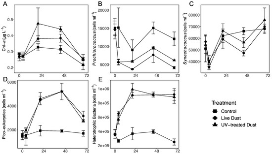 Temporal variability in Chl-a (A), Prochlorococcus (B), Synechococcus (C), picoeukaryotes (D), and heterotrophic bacteria (E) following 0.8 mg L−1 of “live dust” (circle), “UV-treated dust” (triangle) or unamended controls (square). Data shown are the average ± SD (n = 3).