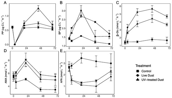 Temporal variability in primary production (PP) (A), bacterial production (BP) (B), beta-glucosidase (β-Glu) (C), leu-aminopeptidase (AMA) (D), and alkaline phosphatase activity (APA) (E) following 0.8 mg L−1 of “live dust” (circle), “UV-treated dust” (triangle) or unamended controls (square). Data shown are the average ± SD (n = 3).
