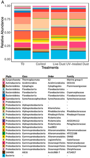 This effect could have resulted from the (1) introduction of competitors for the same food resources, for example heterotrophic bacteria [61,62] and/or (2) introduction of predatory and/or pathogenic entities, for example viruses [12,63]. Indeed, the dust used in the experiment contained bacteria as well as other marine organisms (Figure 4, Supplementary Table S5), which could compete with ambient phytoplankton for resources and may have served as vectors for viruses.