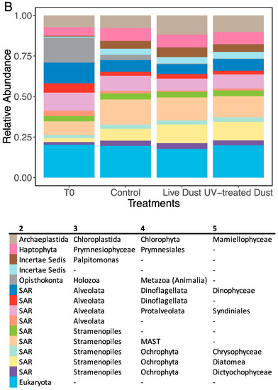 Relative abundance of prokaryotes (A) and eukaryotes (B) in the NRS surface water before amendment (T0) and 44 h after amendment for control, live dust, and UV-treated dust treatments. Data shown are the sum of triplicates. The last row in both legends is the sum of all rare taxa (constituting <5% of relative abundance). In (A), A and B in the first column of the legend corresponds to archaea and bacteria, respectively. In (B), column names 2–5 represent taxonomic levels.