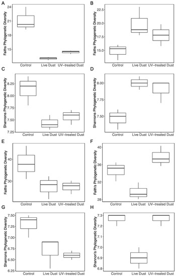 Diversity indices of prokaryotes, (A) Shannon’s diversity indices at 20 h (B) Faith’s phylogenetic diversity indices at 20 h, (C) Shannon’s diversity indices at 44 h (D) Faith’s phylogenetic diversity indices at 44 h, and diversity indices of eukaryotes, (E) Shannon’s diversity indices at 20 h (F) Faith’s phylogenetic diversity indices at 20 h, (G) Shannon’s diversity indices at 44 h (H) Faith’s phylogenetic diversity indices at 44 h, for control, live dust, and UV-treated dust treatments. The ends of the box are the upper and lower quartiles, so the box spans the interquartile range. The median for each treatment of three replicates is marked by a horizontal line inside the box. The whiskers are the two lines outside the box that extend to the highest and lowest observations.