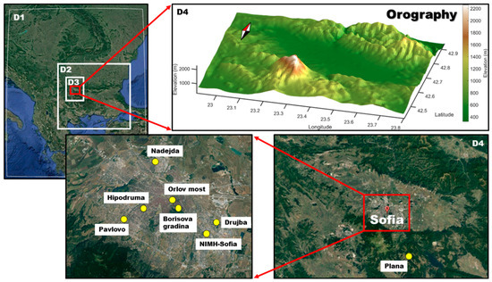 - Vladimirov, E.; Dimitrova, R.; Danchovski, V. Sensitivity of the WRF Model Results to Topography and Land Cover: Study for the Sofia Region; Annuaire de l’Université de Sofia “St. Kliment Ohridski”, Faculté de Physique: Sofia, Bulgaria, 2018; Volume 111, pp. 87–106. [Google Scholar]