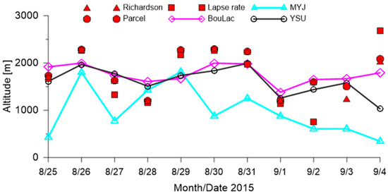 - LeMone, M.A.; Tewari, M.; Chen, F.; Dudhia, J. Objectively determined fair-weather CBL depths in the ARW-WRF model and their comparison to CASES-97 observations. Mon. Weather Rev. 2013, 141, 30–54. [Google Scholar] [CrossRef]