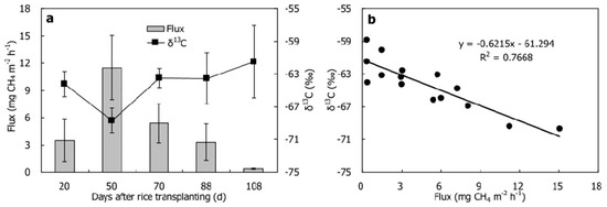 - Bilek, R.S.; Tyler, S.C.; Sass, R.L.; Fisher, F.M. Differences in CH4 oxidation and pathways of production between rice cultivars deduced from measurements of CH4 flux and δ13C of CH4 and CO2. Glob. Biogeochem. Cycles 1999, 13, 1029–1044. [Google Scholar] [CrossRef]