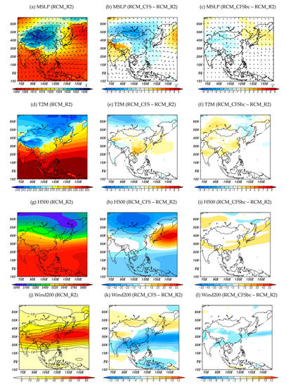 Climatological (1982–2006) December–January–February (DJF) mean field (reanalysis-driven (RCM_R2), left) and difference between reanalysis-driven (RCM_R2) and RCM_CFS (RCM_CFS–RCM_R2, center), RCM_CFSbc (RCM_CFSbc–RCM_R2, right) for (a–c) mean sea level pressure (hPa; shaded) and 850 hPa wind (m/s; vector), (d–f) 2 m temperature (K), (g–i) 500 hPa geopotential height (gpm), and (j–l) 200 hPa wind magnitude (m/s).