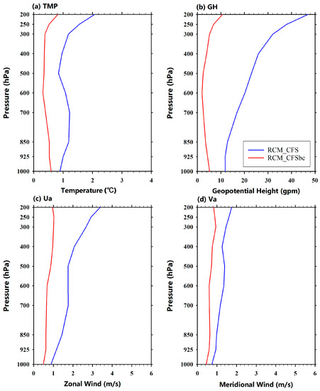 Figure 3 shows the vertical RMSD (root mean square difference) profiles of temperature, geopotential height, zonal wind, and meridional wind between two GCM-driven simulations (RCM_CFS and RCM_CFSbc) and RCM_R2. The RCM_CFS underestimates the temperature in the mid- and upper-level as compared to the RCM_R2 (not shown), which results in a systematically lower geopotential height in the troposphere (see Figure 2h). The negative biases in the temperature and geopotential height can be largely eliminated when the GCM bias correction is applied (Figure 3a,b). Similar to the temperature and height, the simulated zonal and meridional wind are improved by using the GCM bias correction (Figure 3c,d). This improvement is especially notable in the upper troposphere. The biases in the RCM_CFS experiment are becoming larger from the surface to the troposphere, while the differences in the RCM_CFSbc remain, regardless of the level. One possible reason for this is that the large-scale nudging technique in GRIMs-RMP is designed to use a vertically weighted damping coefficient. The reduction of this nudging factor in the lower troposphere allows a geostrophic nature. As a result, the effect of bias correction is greater in the upper troposphere and its influence can be more easily transmitted into the RCM domain.