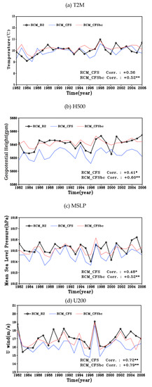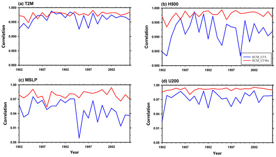 Time series of pattern correlation between RCM_R2 and RCM_CFS (blue line), RCM_CFSbc (red line) experiment for (a) 2 m temperature, (b) 500 hPa geopotential height, (c) mean sea level pressure, and (d) 200 hPa zonal wind.