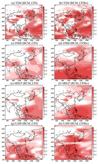 Figure 5 shows the distribution of the temporal correlation coefficient between the RCM_R2 and GCM-driven simulations for large-scale variables. The simulated 2 m temperature obtained by the RCM_CFS shows a high correlation coefficient in the part of Northeastern Asia, Maritime Continent, and Pacific Ocean (Figure 5a). The correlations are more prominent in the RCM_CFSbc simulation, and the areas with a 95% confidence level are also widely distributed (Figure 5b). The correlations between the RCM_R2 and RCM_CFS are weak over land at a height of 500 hPa and sea level pressure (Figure 5c,e), which is related to an underestimation of the Siberian high (see Figure 2e,h). The result of the RCM_CFSbc shows a positive effect of the bias correction on the simulated climate (Figure 5d), whereas its effect is not significant in sea level pressure (Figure 5f). The 200 hPa zonal wind simulation is relatively improved in the RCM_CFSbc experiment as compared to that in the RCM_CFS (Figure 5g).