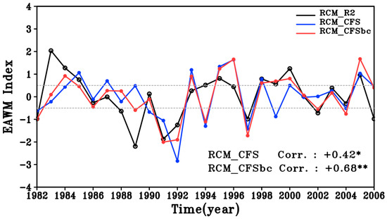 Normalized East Asian winter monsoon (EAWM) index [56] for the RCM_R2 (black), RCM_CFS (blue), and RCM_CFSbc (red) experiment and correlation coefficient between RCM_R2 and RCM_CFS, RCM_R2 and RCM_CFSbc experiment during 1982–2006. Two gray dashed lines indicate ±0.5σ (* and ** indicate significant at the 95% and 99% confidence levels, respectively).