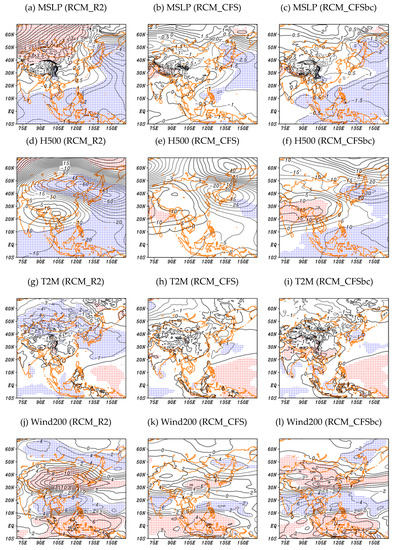 Composite difference distribution (strong–weak monsoon years) of the (a–c) mean sea level pressure, (d–f) 500 hPa geopotential height, (g–i) 2 m temperature, and (j–l) 200 hPa wind magnitude for RCM_R2 (left), RCM_CFS (center), and RCM_CFSbc (right) experiments. Stippled areas indicate significance at the 95% confidence levels (positive value is red, and negative value is blue).