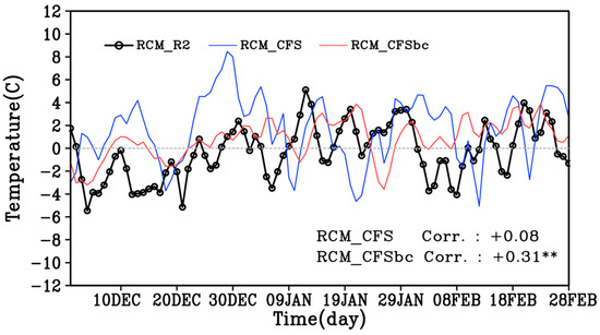 Time series of daily anomaly of 2 m temperature for RCM_R2 (black line), RCM_CFS (blue line), and RCM_CFSbc (red line) experiment during DJF 2005/06 over East Asia (110° E–130° E, 20° N–45° N). Correlation coefficients are also shown at the bottom right in the figure and ** indicates significance at the 99% confidence level.