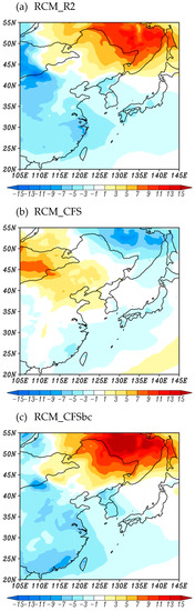 Figure 9 shows the time series of the daily 2 m temperature anomalies in East Asia during the winter of 2005. The first cold surge occurred on 2 December. Considering a typical period of a cold surge, 5–14 days [58], this cold weather was extraordinarily prolonged. The simulated temperatures in the experiment with non-corrected CFS data as the boundary condition are higher than those of the RCM_R2 during December 2005. In particular, the simulated temperature in early December 2005, when the cold surge started, increases gradually. However, in the experiment where the bias-corrected CFS data were used, the temperature variations are relatively similar to those of the RCM_R2 experiment.