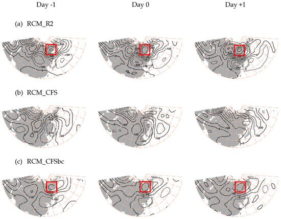 Geopotential height anomaly (gpm) at 300 hPa for (a) RCM_R2, (b) RCM_CFS, and (c) RCM_CFSbc experiment during −1 day to +1 day relative to the cold surge occurrence on 2 December 2005. Contour intervals are 100 m.