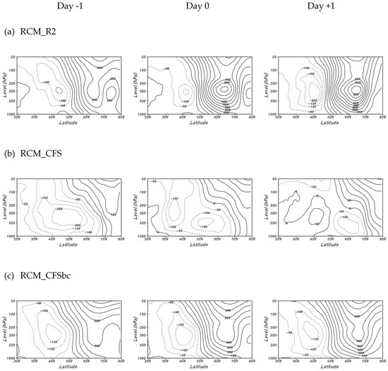 In order to examine the vertical structure of the upper-level and lower-level circulation fields, we analyzed the vertical distribution of the geopotential height (Figure 12). Figure 12a shows positive anomalies in the high-latitudes and negative anomalies in the mid-latitudes. On the day of the cold surge, the positive anomalies appear stronger and continue until the next day, which indicates a strong barotropic atmosphere structure of upper-level blocking. Strong positive anomalies above 50° N cause an anticyclonic circulation at the surface, thus allowing the Siberian high to expand to East Asia. According to Takaya and Nakamura [64], a vertically strong coupling causes cold advection in the lower-level, which expands the anticyclonic circulation at the surface. In the RCM_CFS experiment, negative anomalies are dominant up to 60° N, and positive anomalies do not expand to the surface (Figure 12b). As a result, RCM_CFS weakly simulates the Siberian high, thus reducing the inflow of cold air to East Asia. In the experiment with bias correction, the positive anomalies are slightly underestimated, but a nearly barotropic structure of upper-level blocking (Figure 12c).