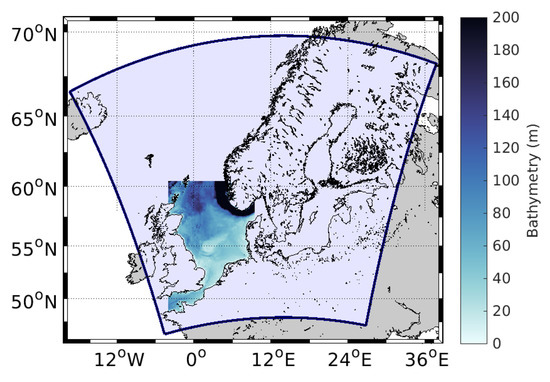 Bathymetry of the wave model WAM (shaded) and area of the atmospheric model CCLM (box).