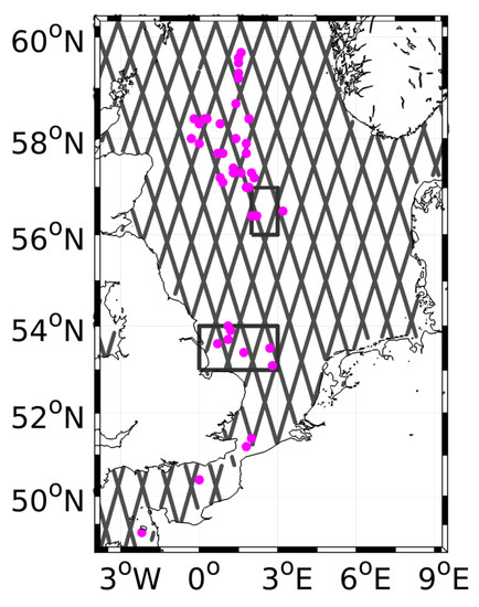 Locations of the in situ measurements (magenta dots) and the satellite measurements (grey tracks). The southerly box indicates the area of the in situ measurements used for the comparisons in Section 3. The northerly box indicated the area of the Hovmöller diagrams in Section 4.1.