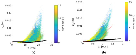 Scatter plots of the (a) wind speed (ff) and (b) friction velocity () against the roughness length () for the reference model simulation (black dots) and the coupled model simulation (coloured dots). The red lines indicate the least-squares best-fit lines of the roughness lengths calculated by WAM. Values of 0.001 represent the roughness length of sea ice.