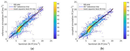 Q–Q scatter plots for the measured (Sentinel-3A) wind speeds and modelled wind speeds with the (a) reference and (b) coupled model simulations for January 2017. The Q–Q plot is shown as black crosses, the 45 reference line is denoted by the blue line, and the least-squares best-fit line is the red line.