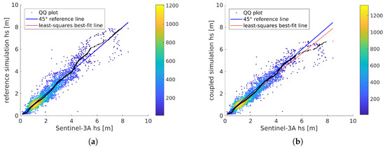 Q–Q scatter plots for the measured (Sentinel-3A) significant wave heights and modelled significant wave heights with the (a) reference and (b) coupled model simulations for January 2017. The Q–Q plot is shown as black crosses, the 45 reference line is denoted by the blue line, and the least-squares best-fit line is the red line.