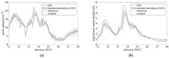 The largest differences both in the wind speed and in the significant wave height occur during extreme events with large wind speeds and significant wave heights (Figure 4 and Figure 5). Therefore, the model results are compared with GTS measurements recorded during one extreme event in January 2017 by buoys located off the coast of England (53 N, 0 E to 54 N, 3 E). For this comparison, the measurements acquired at the same time from the seven buoys within that small area (see the black box in Figure 2) are averaged. The results of the models collocated with the buoys are then averaged as well. As shown in Figure 6, the results of the coupled model simulation are closer to the observations than are the results of the reference model simulation. In particular, under the high wind speeds and large significant wave heights observed on the 11th/12th and 13th/14th of January 2017, the coupled model performs substantially better than the reference model. During these periods, the results of the reference model simulation are outside the standard deviation range of the GTS measurements, while the results of the coupled model simulation are well within the range of standard deviations. During the calm conditions after the storm, both model simulations produce rather similar results that are close to the measurements (Figure 6).