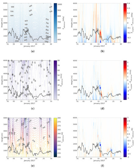 Hovmöller diagrams (a,c,e) of the results from the reference model simulation and (b,d,f) of the differences between the reference and coupled model simulations in the North Sea for January 2017 for the (a,b) air pressure, (c,d) wind speed and (e,f) temperature. The black lines indicate the planetary boundary layer (PBL) height in the reference model simulation, and the grey lines indicate the PBL height in the coupled model simulation.