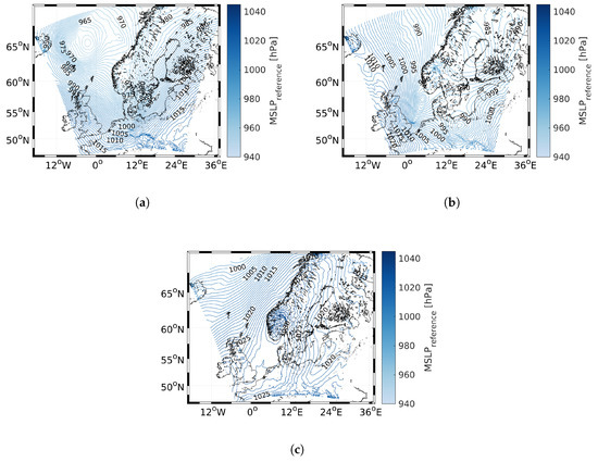 First, the synoptic situation during the time period from 11 to 16 January 2017 is discussed using the mean sea level pressure (MSLP) results from the reference model simulation. On 11 January 2017, the centre of the low-pressure system is located between Iceland and Norway, and a secondary low-pressure system is located over the southern coast of Norway close to Oslo (Figure 8a). The associated pressure gradient across the North Sea is quite steep, causing high northwesterly winds in the North Sea area. The secondary low moves northeastwards with increasing pressure in the centre and eventually vanishes over Norway. The main low-pressure system moves towards the coast of Norway, after which it moves south along the coast and crosses the North Sea with a convergence zone evolving from the centre to the British coast (Figure 8b). During this storm period, the wind speeds and significant wave heights are quite large. On 13 January 2017 at 9:00 p.m. UTC, the centre of the low-pressure system hits the East Frisian Islands along the German coast, after which it moves further southeastwards and fills up. After this low-pressure system moves out of the area, a high-pressure system develops over the North Sea (Figure 8c) in association with low wind speeds and low significant wave heights throughout that area.