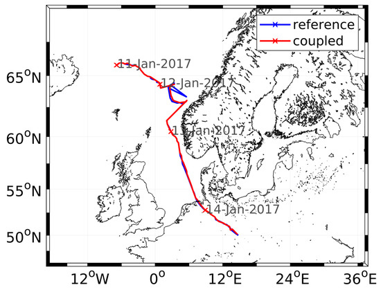 Track of the low-pressure system from 11 January 2017 to 15 January 2017 for the reference model simulation (blue) and the coupled model simulation (red).