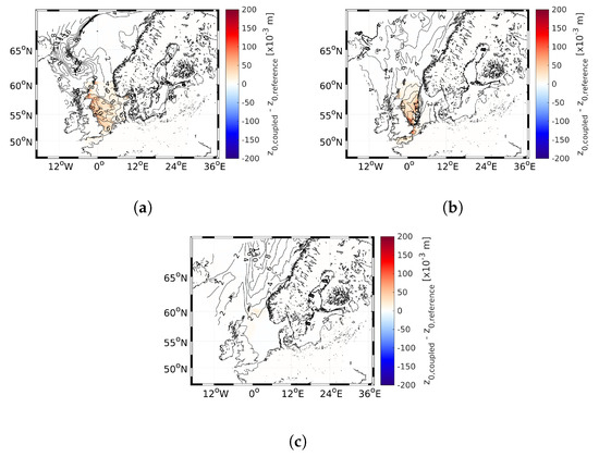 Absolute values of the roughness length in the reference model simulation (contours) and the differences in the roughness length between the coupled and reference model simulations (coloured) on (a) 11 January 2017 at 12:00 p.m. UTC; (b) 13 January 2017 at 12:00 p.m. UTC; and (c) 16 January 2017 at 6:00 a.m. UTC.