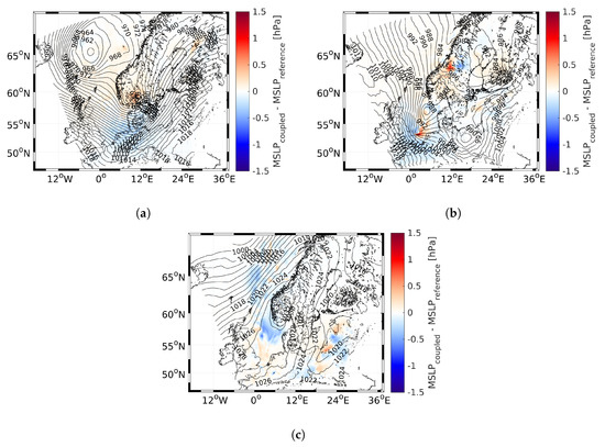 Absolute values of the MSLP in the reference model simulation (contours) and the differences in the MSLP between the coupled and reference model simulations (coloured) on (a) 11 January 2017 at 12:00 p.m. UTC; (b) 13 January 2017 at 12:00 p.m. UTC; and (c) 16 January 2017 at 6:00 a.m. UTC.