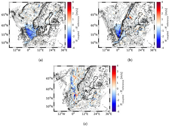 On 11 January 2017 at 12:00 p.m. UTC, the wind speed is also reduced due to the two-way coupling between the atmosphere and the wind waves (Figure 12a). This is mainly due to the enhanced surface roughness (Figure 10a) of the ocean surface because enhanced friction reduces the wind speed close to the surface. In addition, the reduced pressure gradient (Figure 11a) contributes to a reduced wind speed within the North Sea area. Two days later, the largest impacts on the wind speed are observed along the convergence zone (Figure 12b). Slightly east of the convergence zone, the wind speed is enhanced. This corresponds to the shift of the convergence zone towards the east, as seen in the MSLP (Figure 11b). West of the convergence zone, where high wind speeds occur, the wind speed is again reduced due to the enhanced surface roughness. Due to the small pressure gradient across the North Sea on 16 January 2017 at 6:00 a.m. UTC (Figure 8c), the wind speed is considerably low (Figure 12c).