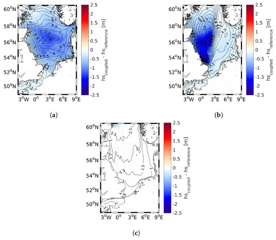 Absolute values of the significant wave height in the reference model simulation (contours) and the differences in the significant wave height between the coupled and reference model simulations (coloured) on (a) 11 January 2017 at 12:00 p.m. UTC; (b) 13 January 2017 at 12:00 p.m. UTC; and (c) 16 January 2017 at 6:00 a.m. UTC.