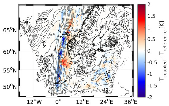 Absolute values of the temperature at the 850 hPa geopotential height in the reference model simulation (contours) and the differences in the temperature between the coupled and reference model simulations (shaded) on 16 January 2017 at 6:00 a.m. UTC.