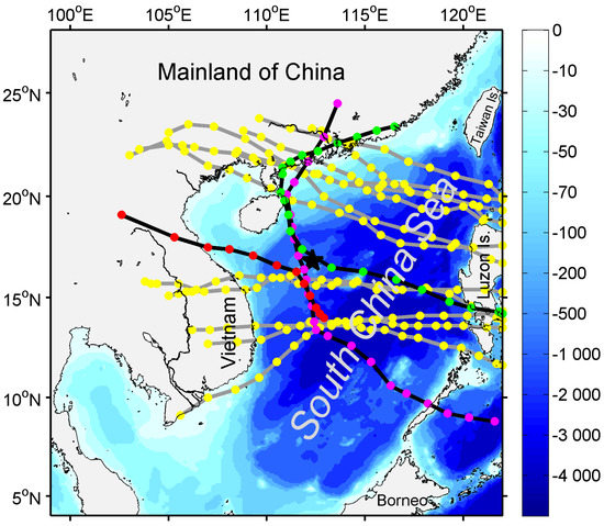 Bathymetry of the South China Sea (unit in m), the position of meteorological sensor (black pentagram) and 15 typhoons from 2001 to 2009. The tracks of typhoons Neoguri, Mekkhala, and Higos are denoted by magenta, red, and green dots, respectively. The trajectories of typhoons Yutu, Molave, Nuri, Koppu, Imbudo, Krovanh, Hagupit, Xangsane, Ketsana, Mirinae, Lingling, and Durian are denoted by yellow dots.