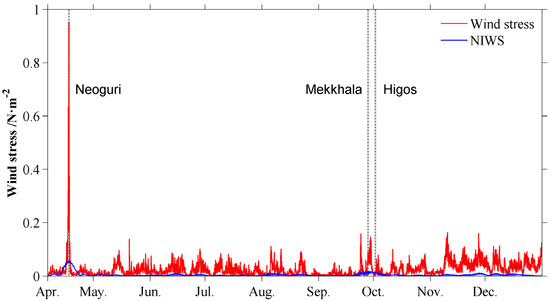 A category 4 tropical cyclone, Neoguri, and two category 2 tropical cyclones, Mekkhala and Higos, passed by the meteorological observation station at Xisha Islands in 2008 (Figure 1). The wind speed recorded by the meteorological sensor was averaged every 1 hour. A Butterworth band-pass filter with a frequency range of 0.85–1.15f [28] was applied to the wind stress to extract the NIWS. As shown in Figure 2, both the wind stress and NIWS were significantly increased when Neoguri (Figure 1) passed by the observation station, while Mekkhala and Higos excited much less increases in the magnitudes of NIWS. It shows that different categories and intensities of a tropical cyclone can induce diverse intensities of NIWS. Then, we apply the wind stress and NIWS to the slab model to compare the magnitudes of corresponding oceanic near-inertial currents in the mixed layer.