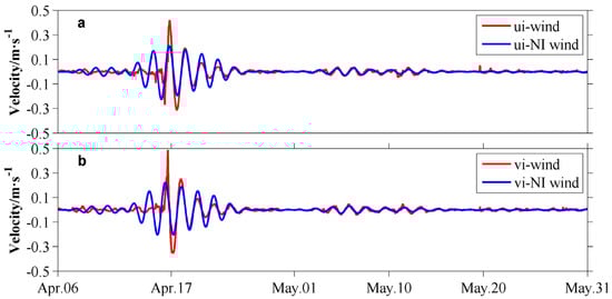 Components of the oceanic near-inertial current (unit in m/s) induced by wind stress (red lines) and the NIWS (blue lines) of Typhoon Neoguri at the observing station in April and May.