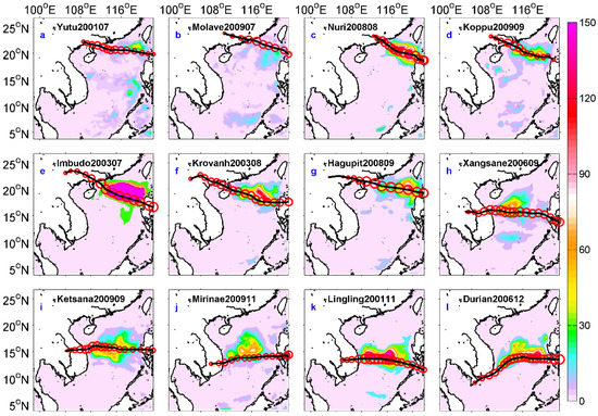 Typhoon tracks and surface 3-day averaged near-inertial kinetic energy (NIKE) (unit in J/m3), filtered from the Hybrid Coordinate Ocean Model (HYCOM) reanalysis data when Typhoons Yutu (a), Molave (b), Nuri (c), Koppu (d), Imbudo (e), Krovanh (f), Hagupit (g), Xangsane (h), Ketsana (i), Mirinae (j), Lingling (k), and Durian (l) passed over the South China Sea (SCS). Here, and subsequently, the red circles indicate the position of the typhoon center every 6 hours, and the size of the circle indicates the magnitude of the typhoon speed.